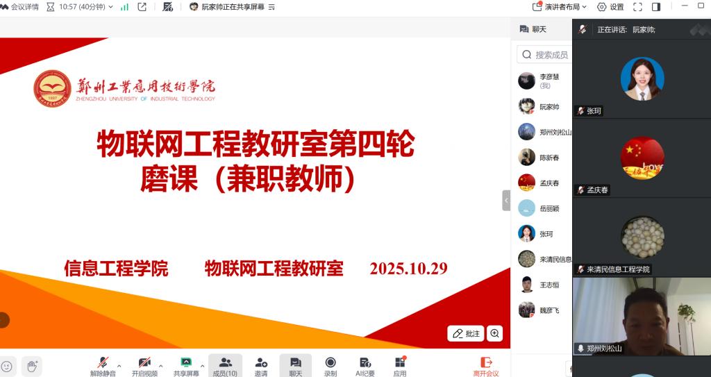 (文图/李彦慧)为扎实推进本科教学审核评估迎评工作,全面提升兼职教师课堂教学质量,2025年10月29日下午,物联网工程教研室举行了第四轮兼职教师线上磨课活动。