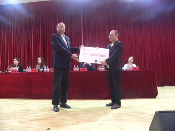 在IOS俱乐部授牌环节,AAA集团副总经理范宝珠女士宣读了郑州工业应用技术学院大学生IOS科研俱乐部首批核心成员名单,谭同德院长、汪守斌书记共同为IOS俱乐部揭牌。