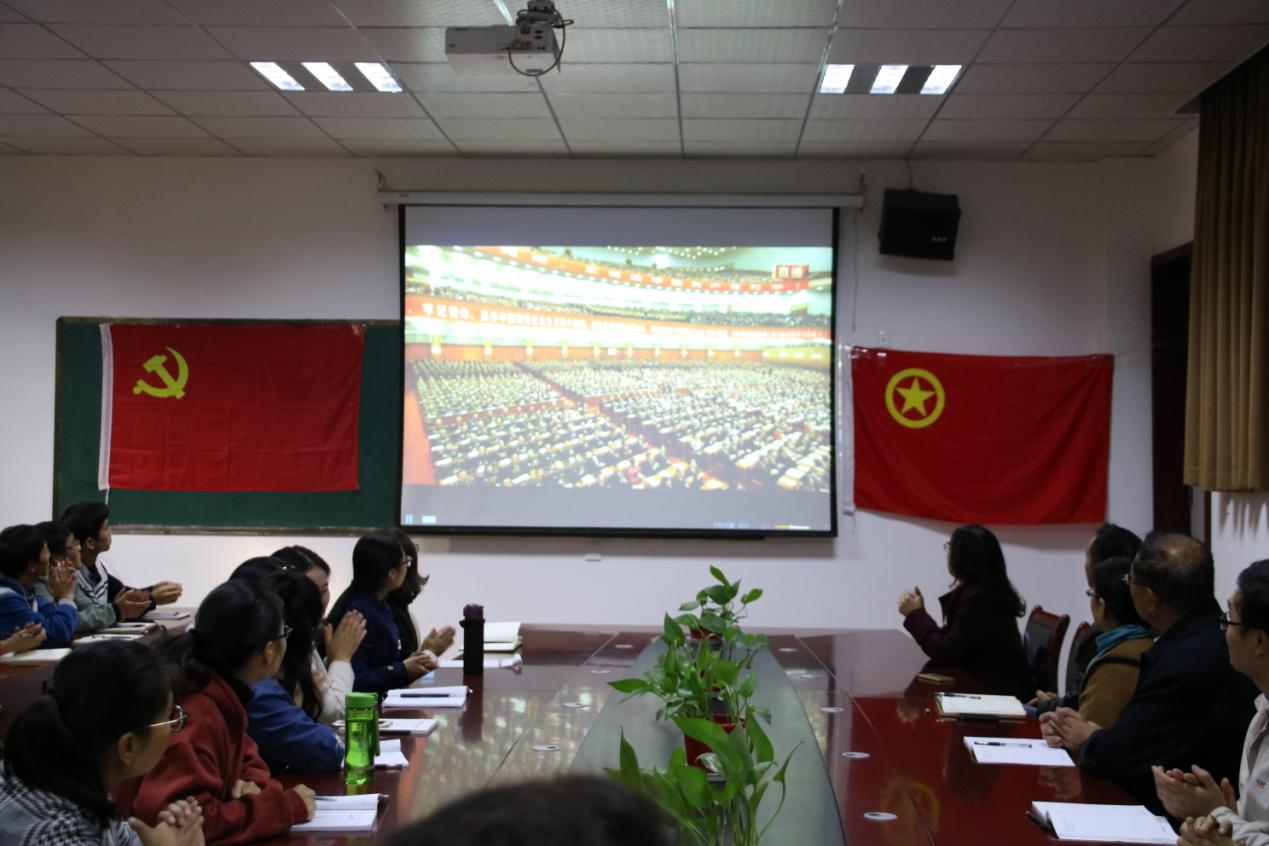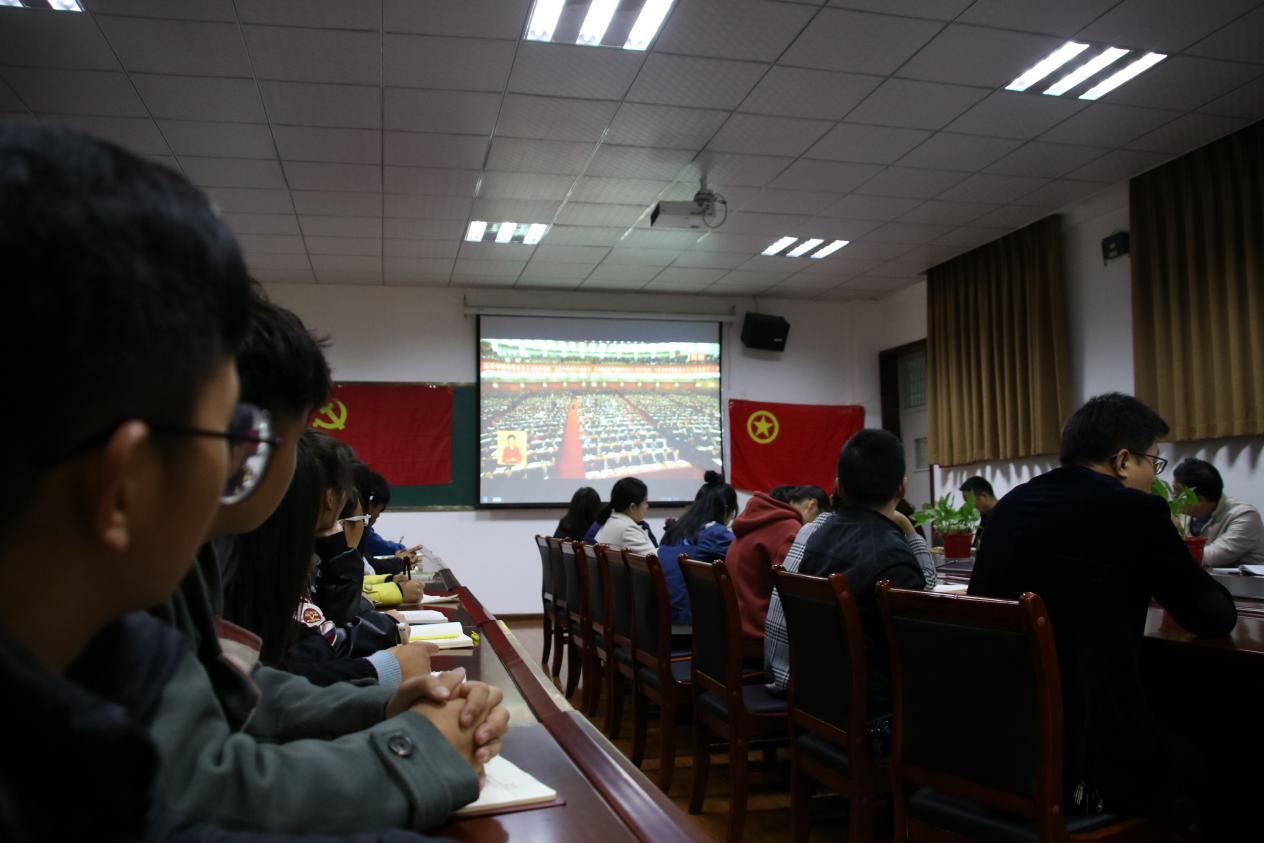 中国共产党第十九次全国代表大会于10月18日在北京隆重开幕,这是在全面建成小康社会决胜阶段、中国特色社会主义发展关键时期召开的一次十分重要的大会,是全党、全国各族人民政治生活中的一件大事。为了及时学习党的十九大精神,紧跟党组织步伐,信息工程学院组织教师代表、学生党员代表、学生代表于8:40分在信科3-305会议室观看党的十九大开幕会。