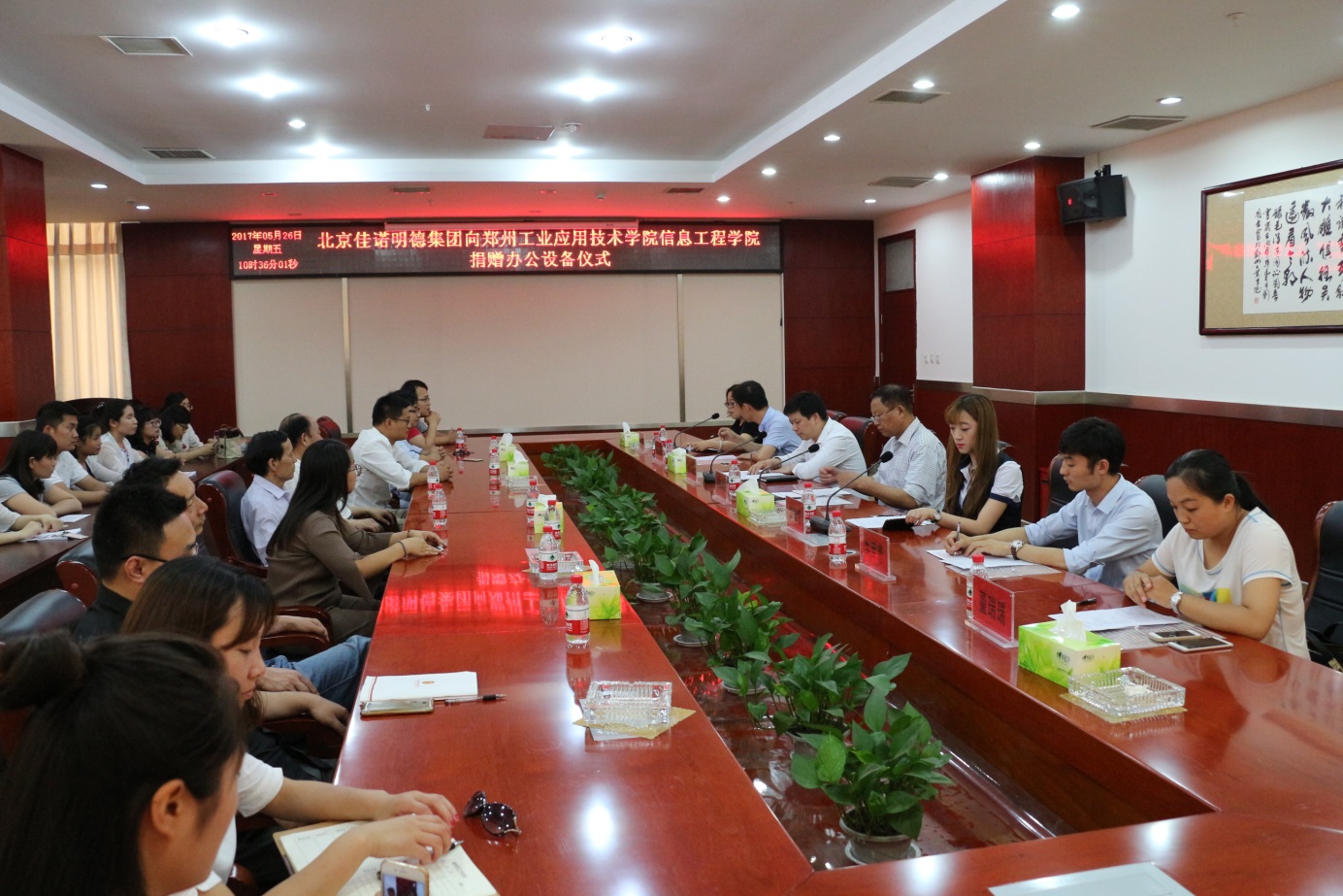 5月26日上午,在我校行政管理中心第一会议室北京佳诺明德集团向信息工程学院捐赠办公设备。北京佳诺明德集团代表毕瑞雪副总裁、魏大伟大区经理、常智区域经理、王亚茹大区咨询师,校方代表党政办主任张亮、资产处处长牛军青,信息工程学院领导班子谭同德、董瑞瑞、毛建景以及50名师生代表共同参加了捐赠仪式。捐赠仪式由信息工程学院副院长毛建景主持。