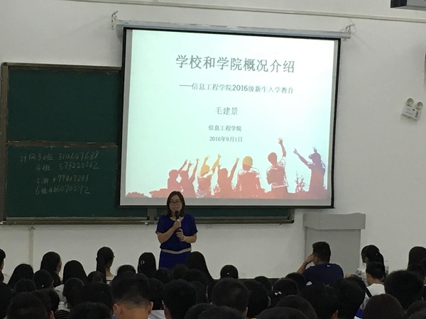 下午,信息工程学院谭同德院长在阶梯五教室针对计算机前沿技术与应用问题进行讲解。谭院长的报告由浅到深,为学生普及了计算机方面的知识,解答了新生对于专业的疑惑,同学们受益匪浅。同时,信息工程学院毛建景副院长在阶梯六教室就学校和学院概况向同学们做了讲解,使新生对于学院发展历程以及文化理念有了更加深刻的了解。另外,亲切的毛院长还给同学们讲解了为人处世、与人为善以及个人修养等方面的知识,同学们深受启发。