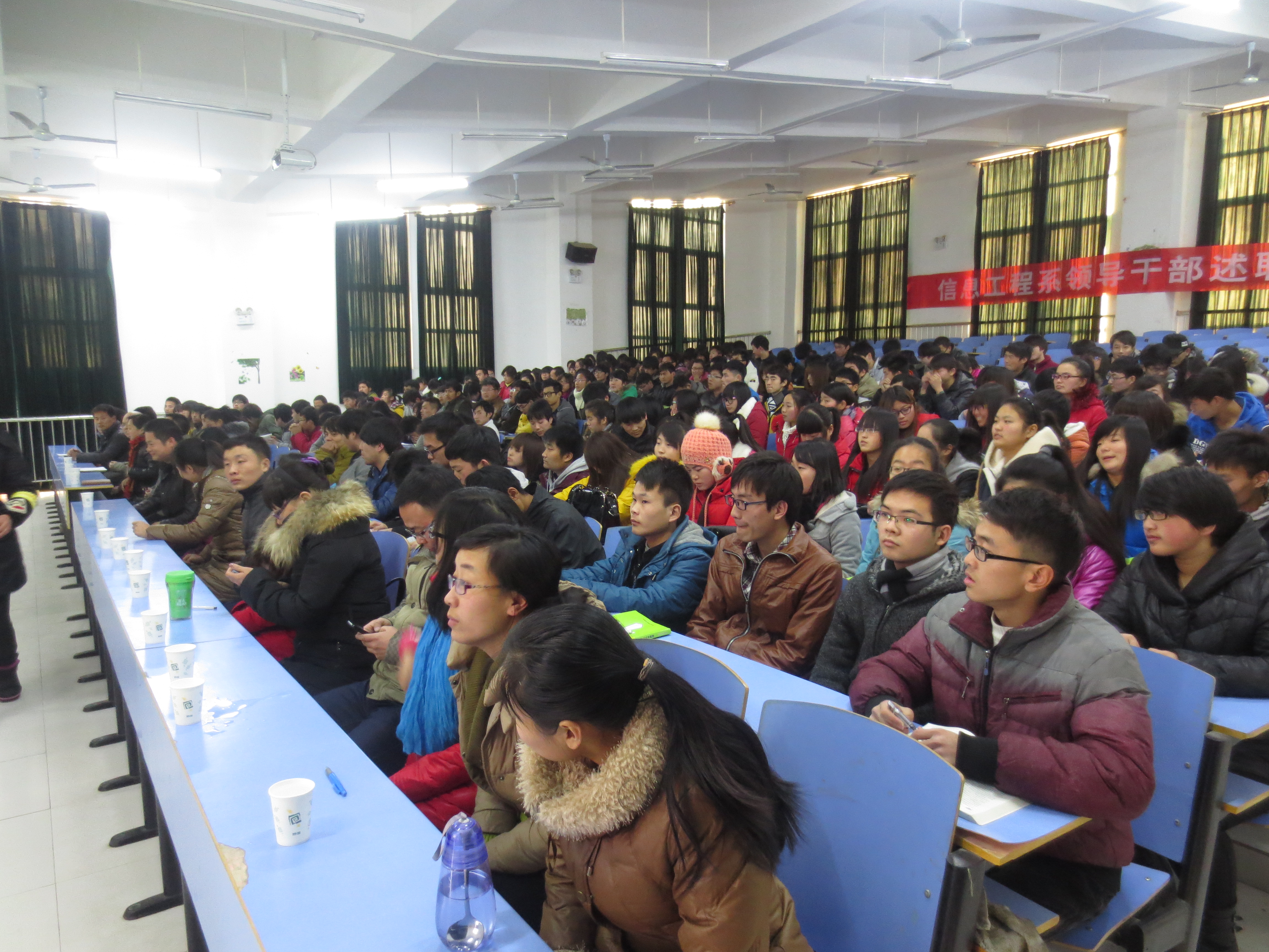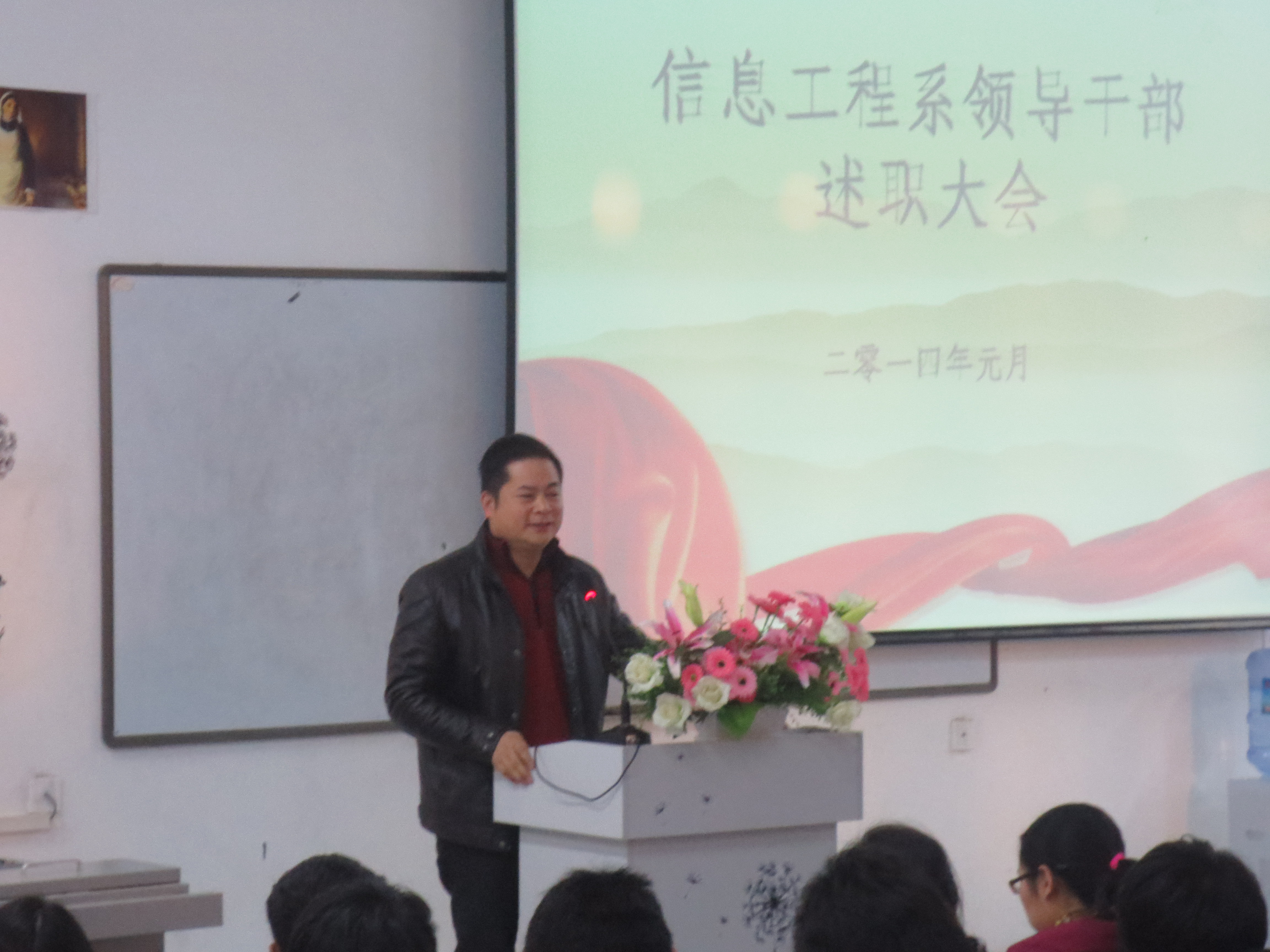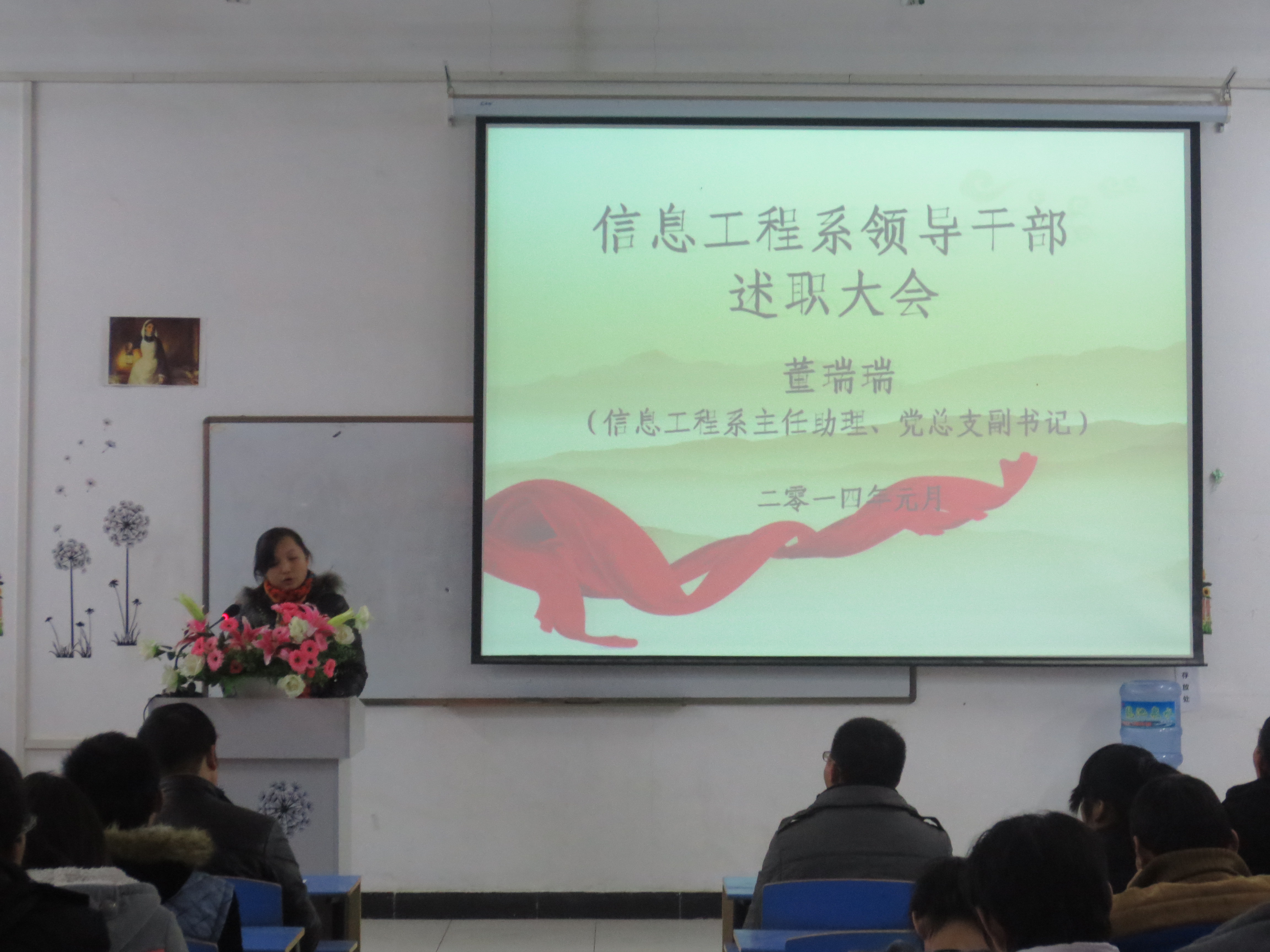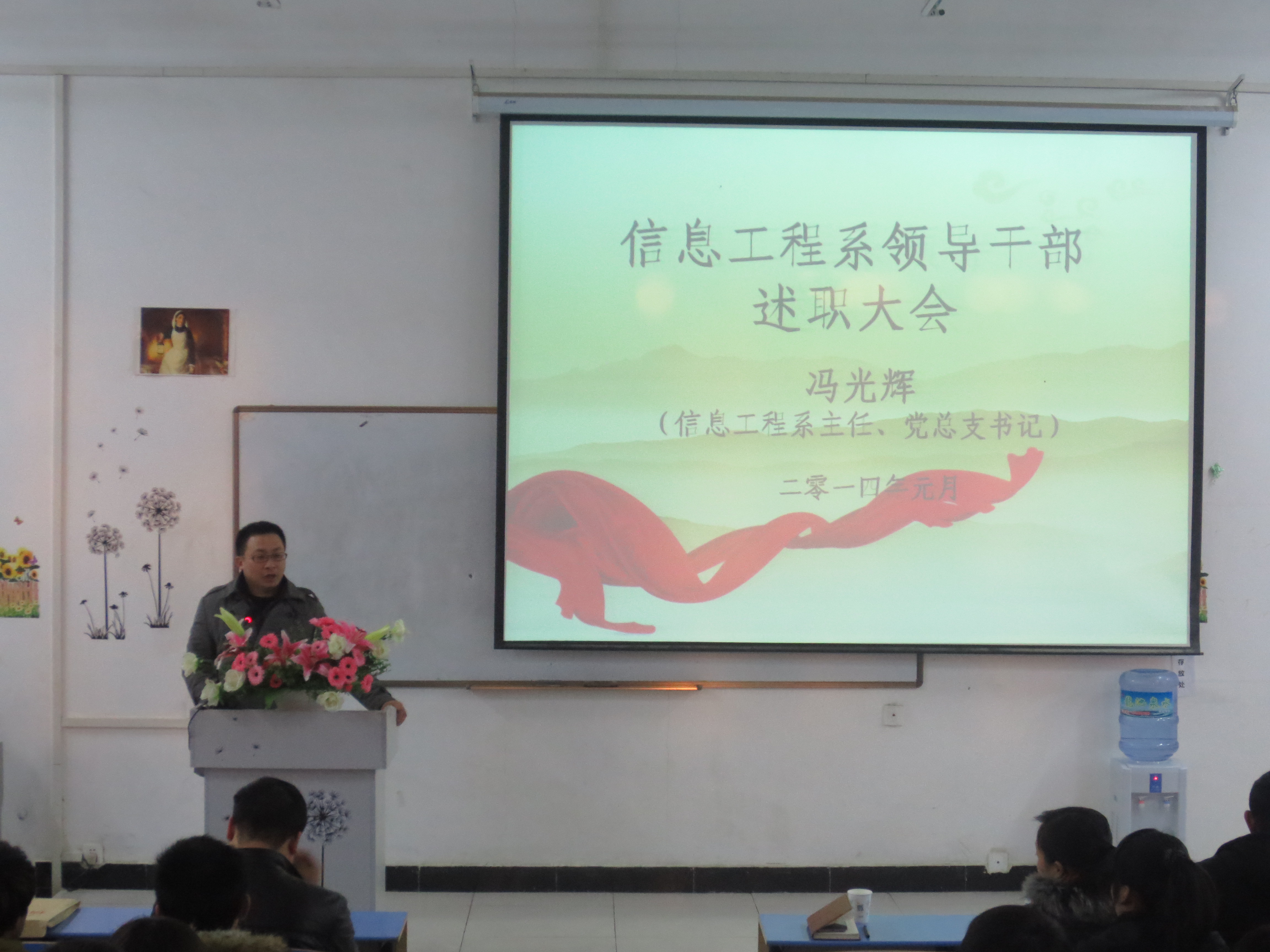 信息工程系2013年领导干部述职测评大会于2014年1月3下午4:30点在信科楼阶五举行。校党委组织部部长王洪海,党政办公室魏改霞老师,教务处高禅老师监督测评。信息工程系主任冯光辉,主任助理董瑞瑞分别进行了述职。系部全体教职工及部分学生代表200人参加了测评。