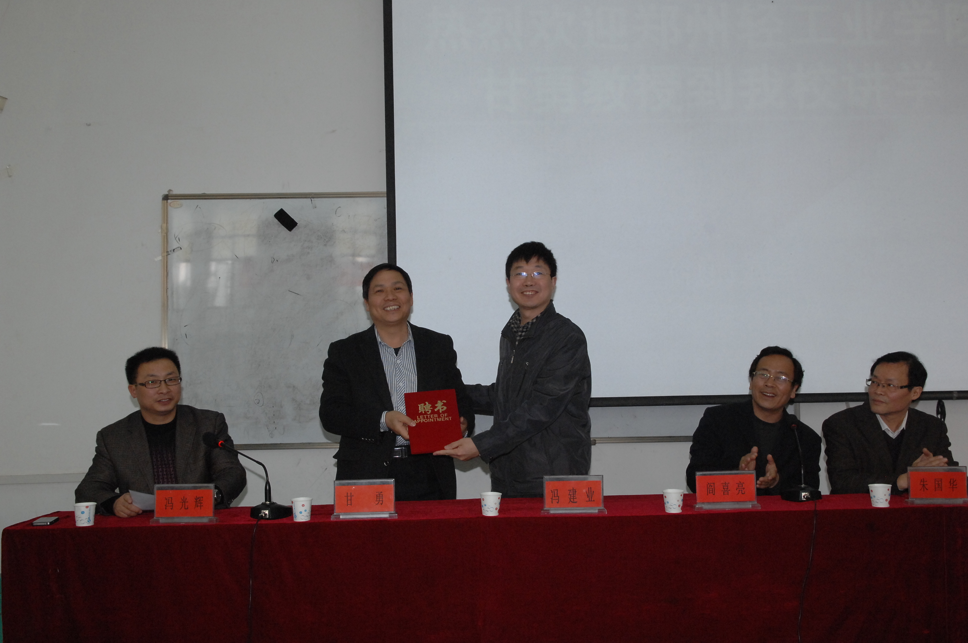 4月23日下午,信息工程系在信息科技楼阶四举行了客座教授聘任仪式暨专题学术报告,仪式上,常务副校长冯建业教授代表学校向甘勇教授颁发了聘书。仪式后,甘勇教授为我系全体师生作了一场主题为《计算机网络技术及发展》的精彩学术讲座。