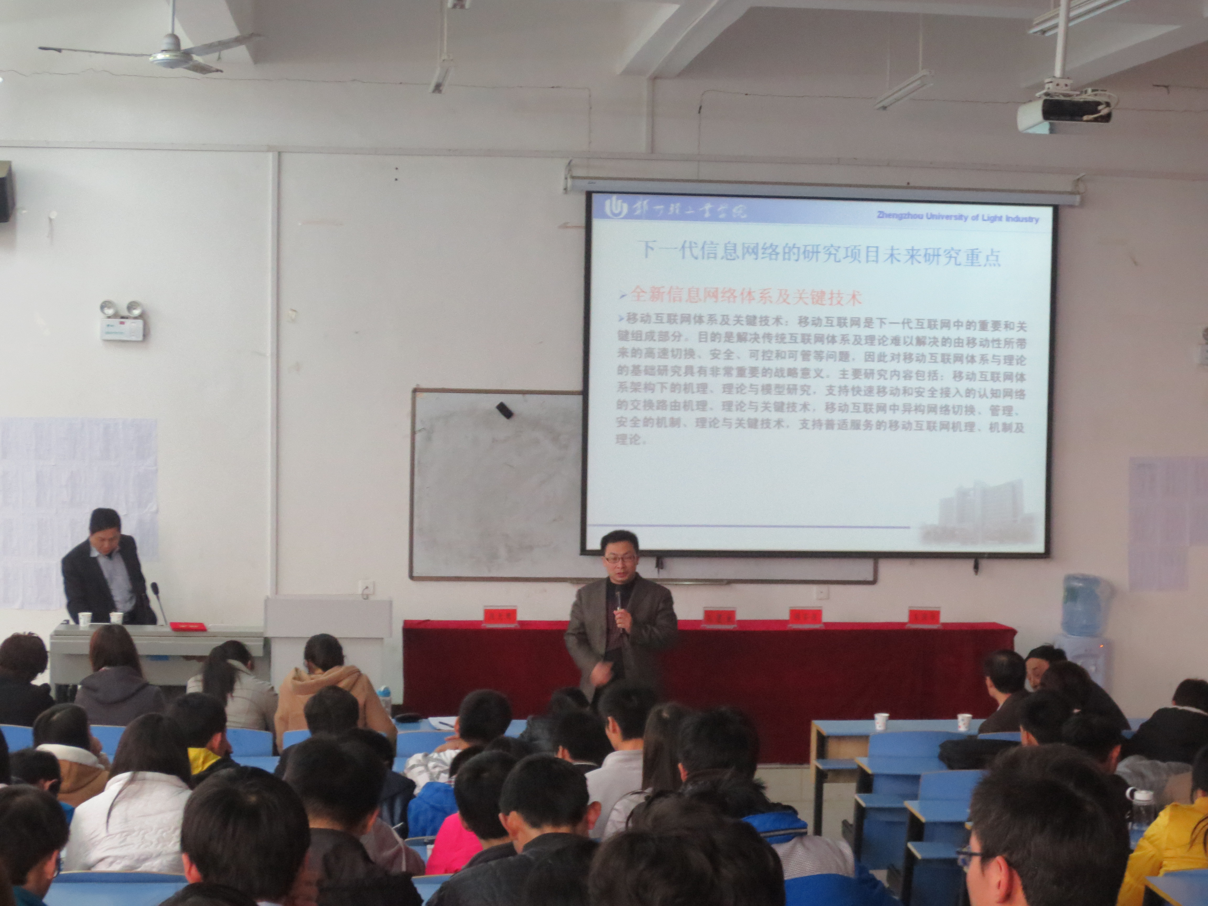 本次学术讲座中甘勇教授主要讲了四点内容。一是日新月异的信息技术;二是宽带网络技术;三是无线网络技术;四是未来网络发展与前景。最后进行了师生互动,甘勇教授认真的解答了同学们提出的问题。通过甘勇教授由浅到深的讲解,全体老师和学生对计算机网络技术有了更深入的了解,同时也为我系教师在计算机网络技术方向的课题研究指明了方向。