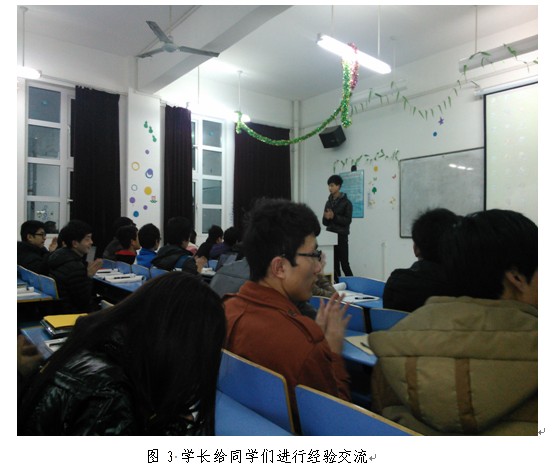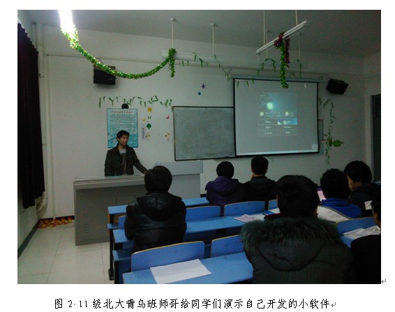 本次经验交流会首先由欧群雍老师为软件技术专业的定位及考取证书方面进行讲解,并针对软件技术专业学生的问题进行答疑;然后由创新小组的学长们向12级软件技术专业的学弟学妹们展示自己的项目,11级北大青鸟的学长给同学们分享一些生活中实用的小程序或软件,让同学们了解所学专业是干什么的,可以做学些什么,更形象的认清学习目标;最后由大三学姐向同学们演示作品和大家分享学习方式和学习成果,交流学习经验;通过这次交流会让同学们明白了只有不断的学习和考取专业方面的证书才能在社会上立足之地。