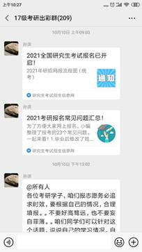 2021全国研究生考试报名10月10日正式开启。当天上午9点孙滨副院长在我院17级考研学生微信群及时转发了“2021全国研究生考试报名已启动通知-2021年研招网报流程图(统考)”、“2021考研报名常见问题汇总!”。孙院长首先在线解读了2021年考研五大关键时间点。