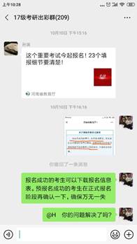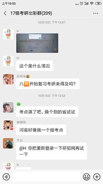 在17级考研学生微信群中,学生针对报名过程中出现的问题,年轻教师、往届考上的学长在群中针对同学们在填报志愿时的疑问及时进行了讲解。有一个同学在填报志愿时出现“无匹配的报考点”提示,经过老师、学长、同学们的解答,已顺利解决。