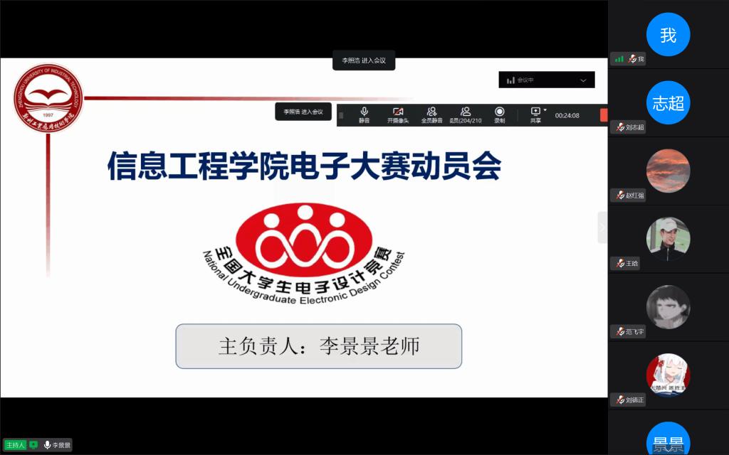 (文/张莹 图/张莹)全国大学生电子设计竞赛是教育部倡导的十大学科竞赛之一,教育部高等教育司、工业和信息化部人事教育司共同主办的全国性大学生科技A类竞赛,2022年11月10日即将举办河南省大学生电子设计大赛。2022年9月7日在学校和学院大力支持下召开了线上动员大会,认真做好参赛学生选拔、赛前组织协调工作。出席本次会议的领导和老师有:信息工程学院院长吕宽州教授、分管副院长侯晓磊副教授和汪守斌副教授、张兴堂教授、宋军罡教授、赤娜副教授、李景景、张吉同、张瑶、张娴静、侯丽红、张莹、陈莎莎老师等,会议由李景景主持。此次参会学生主要涉及2019和2020级电子信息工程、通信工程、物联网工程专业,共计超过200人参加。
