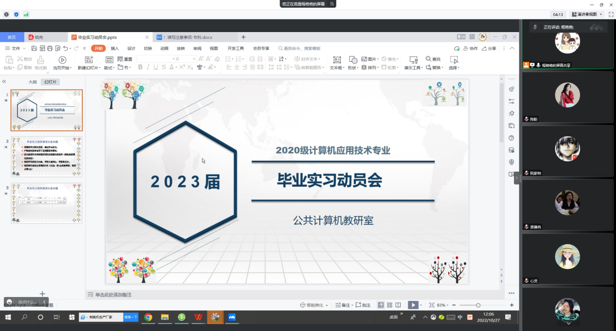 (文/原晨冉 图/原晨冉)2022年10月27日中午,为了保障2023届毕业实习工作的顺利开展,公共计算机教研室举行了2023届计算机应用技术专业毕业实习线上动员会,2023届计算机应用技术专业全体毕业生和毕业实习指导老师参加了本次会议。