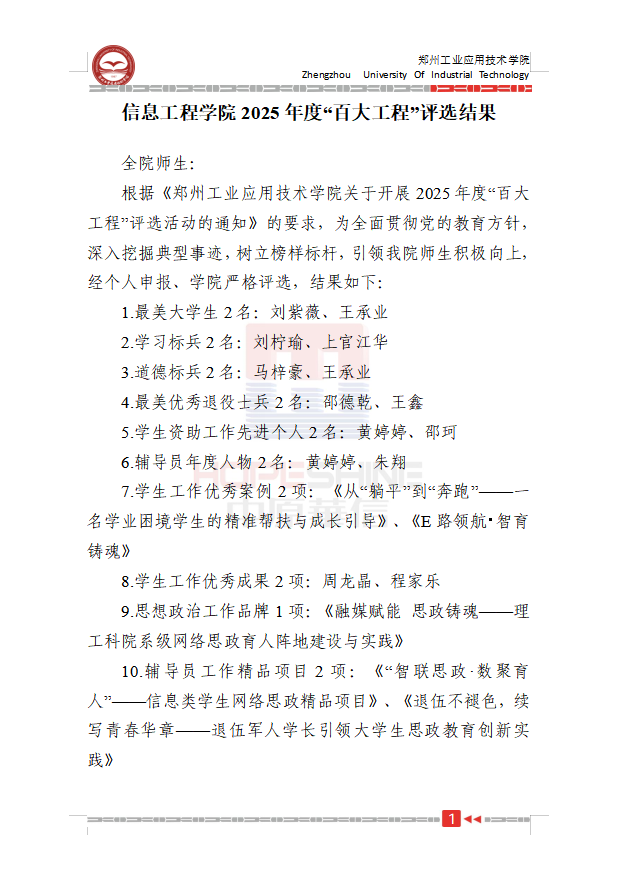 根据《郑州工业应用技术学院关于开展2025年度“百大工程”评选活动的通知》的要求,为全面贯彻党的教育方针,深入挖掘典型事迹,树立榜样标杆,引领我院师生积极向上,经个人申报、学院严格评选,现将评选结果予以公示(详见附件)。